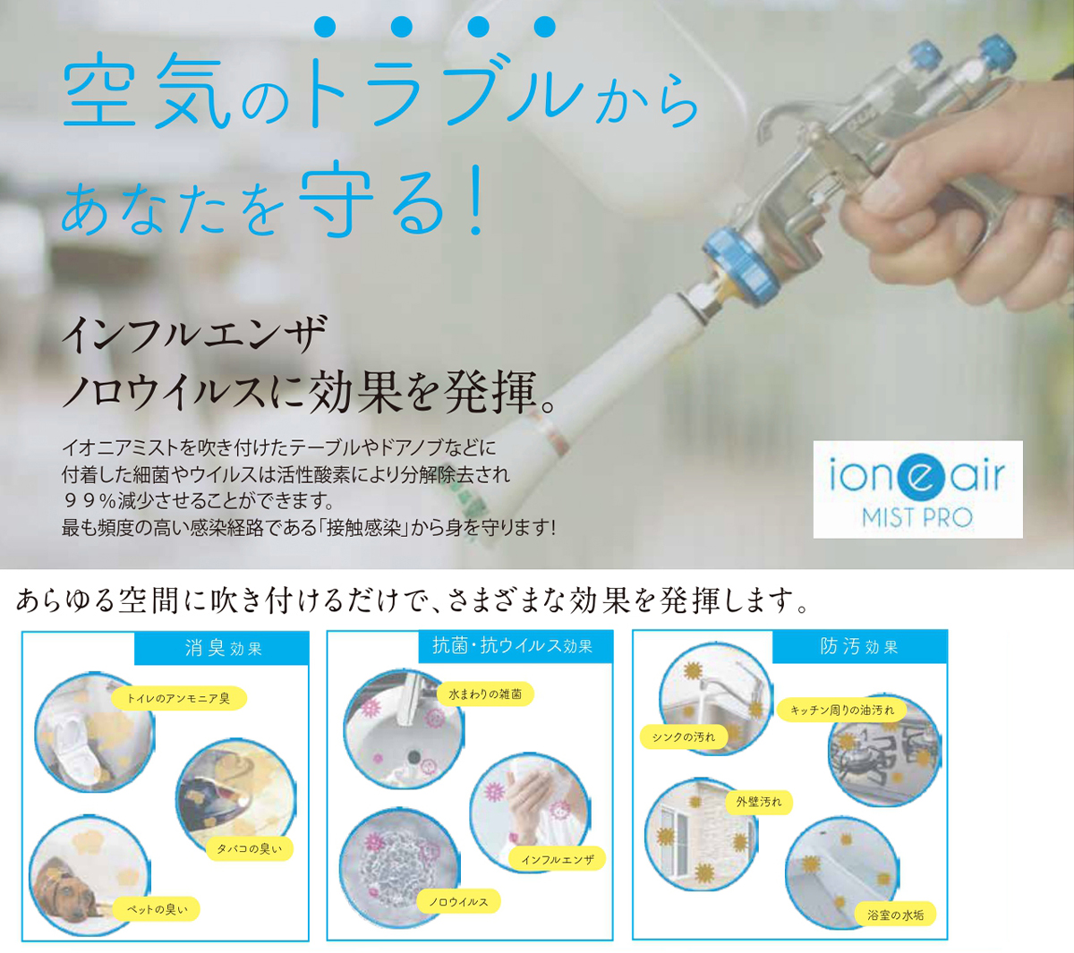 COME TRUE では、インフルエンザ・ノロウイルスに効果を発揮する、イオニアミストプロの吹き付け工事を行っています。